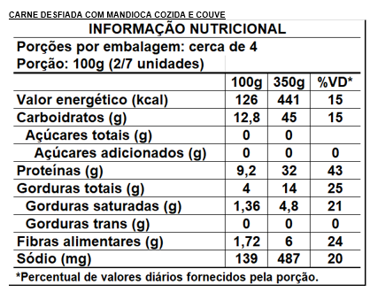 INGREDIENTES: carne bovina magra, mandioca, couve manteiga, tomate, cebola, óleo vegetal, alho, pimentão-vermelho, sal e salsa.
