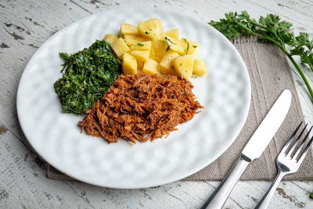 Carne bovina magra, desfiada c/ molho de tomate, acompanhada de mandioca cozida com salsa e azeite e couve refogada
